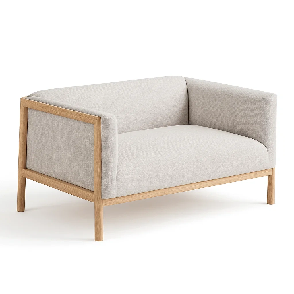 Le canapé deux places est doté d'une structure en bois de chêne robuste et d'un revêtement en tissu polyester beige.