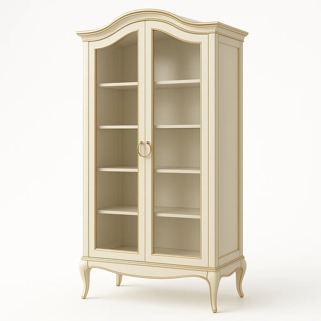 Vitrine d'exposition en bois avec portes en verre trempé blanc et détails dorés