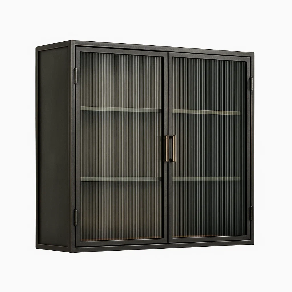 Vitrine d'exposition murale en métal et verre cannelé noir